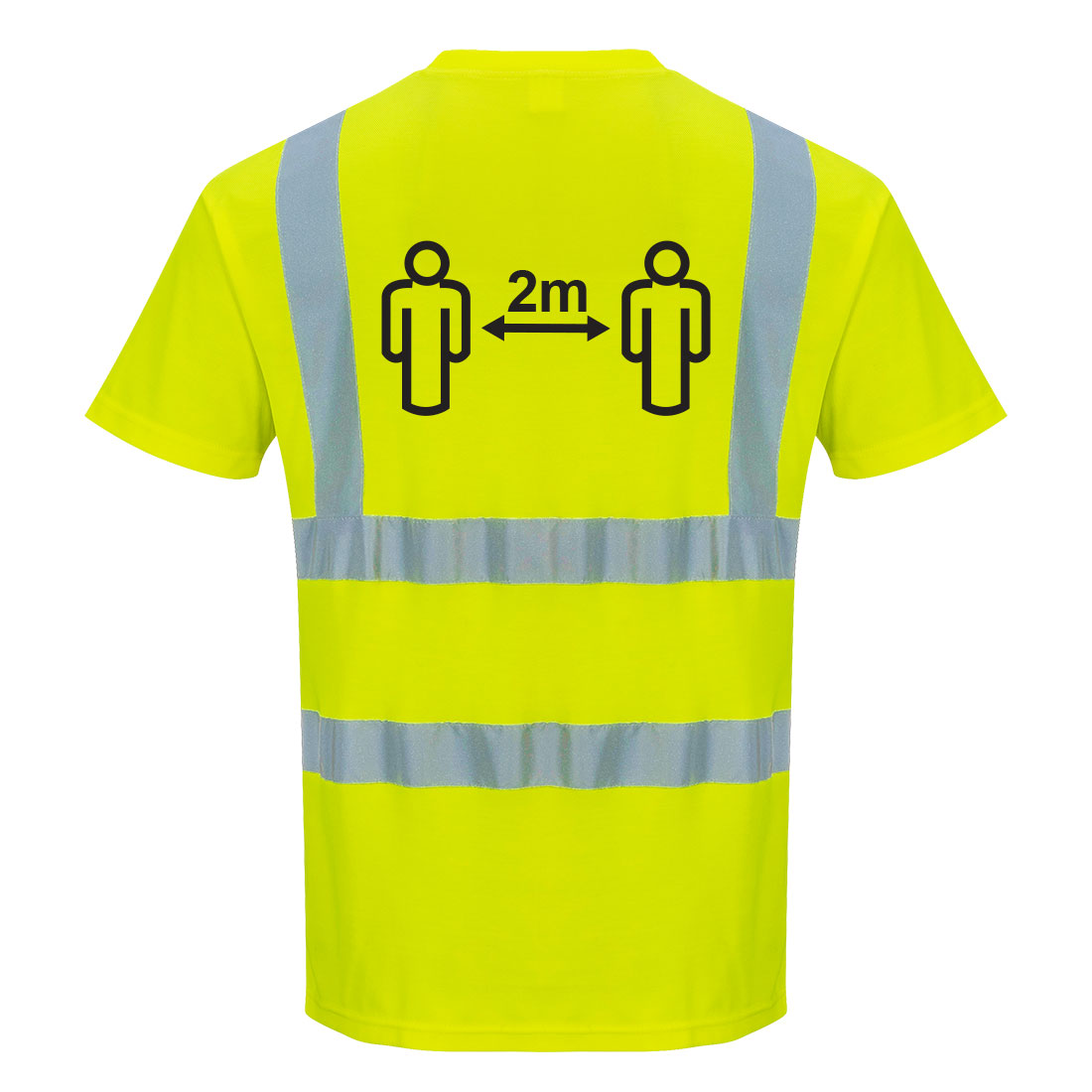 Restez au frais et en sécurité avec le nouveau T-shirt haute-visibilité Distanciation Sociale. Le tissu léger qui évacue la transpiration offre un grand confort de port et une bonne ventilation lors des chaudes journées d’été. Logo de distanciation sociale préimprimé à l’avant et à l’arrière qui peut résister à des lavages répétés.