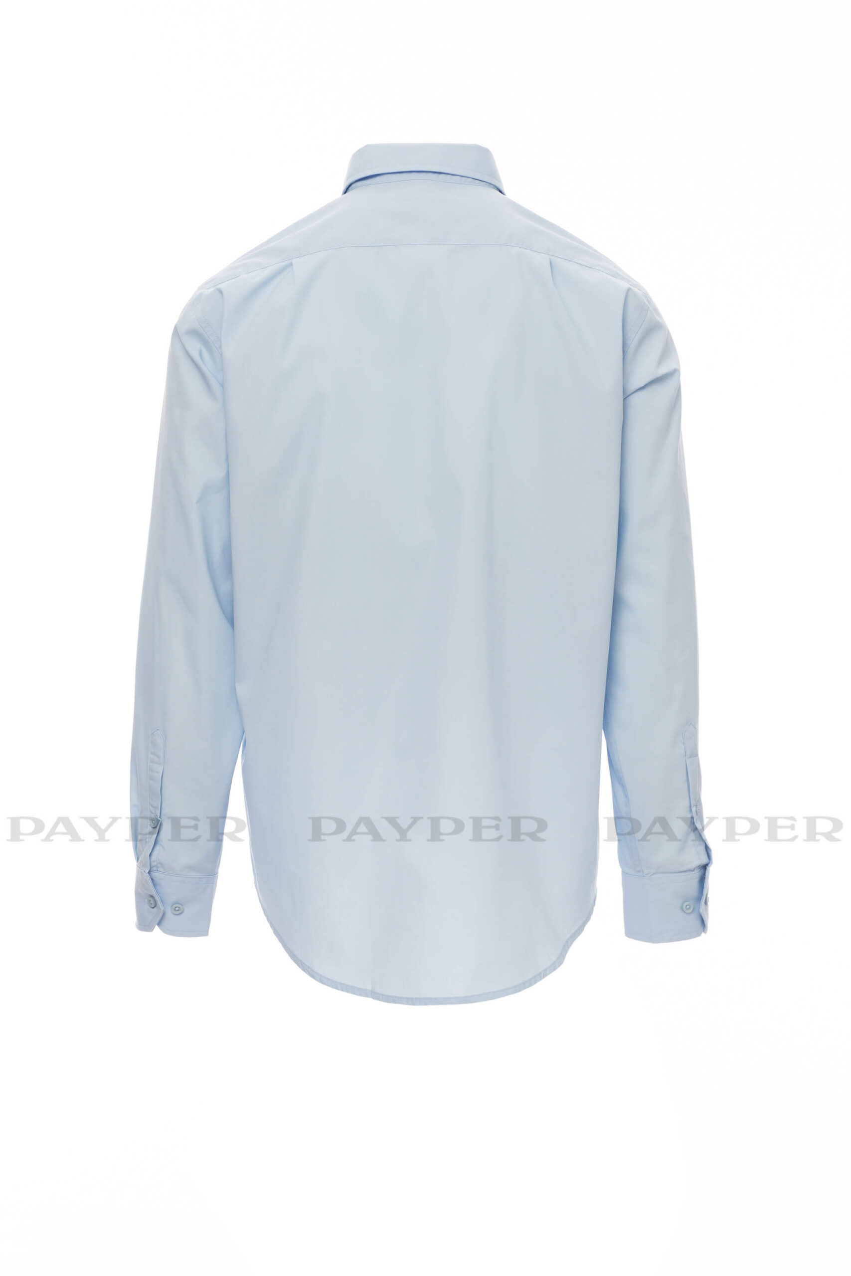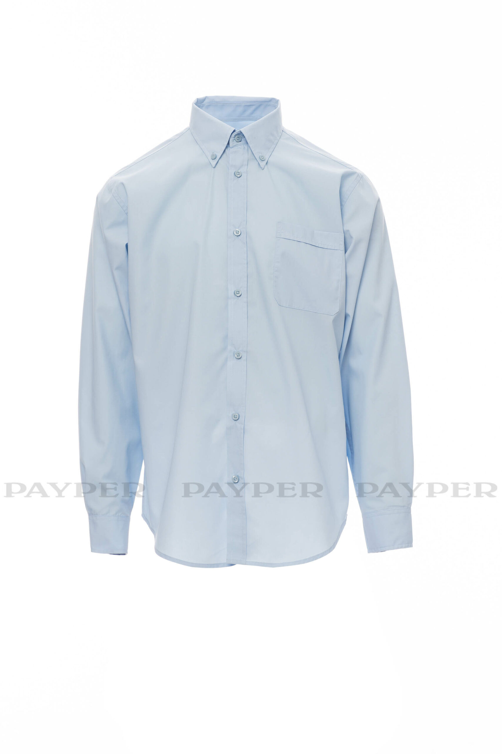 Chemise homme, fil peigné très fin, coupe légèrement cintrée, col boutonné type anglais, poignets arrondis avec deux boutons et une boutonnière, patte de boutonnage visible et boutons nacrés, une poche côté cœur. Empiècement droit dans le dos.