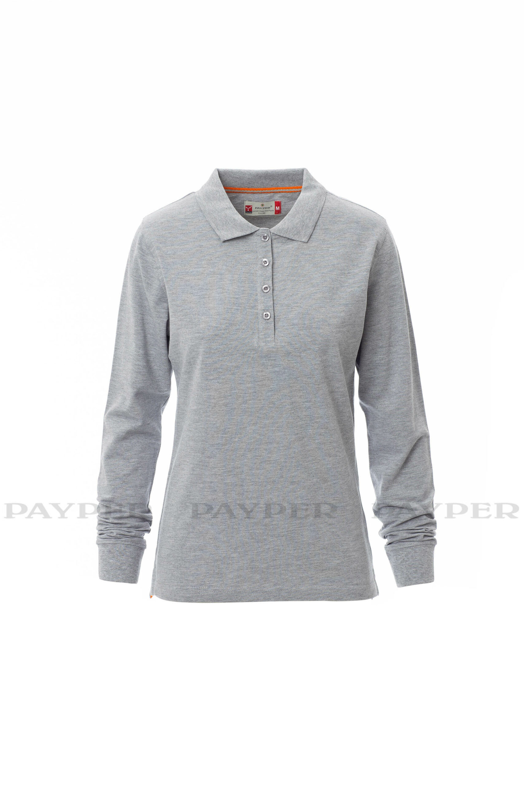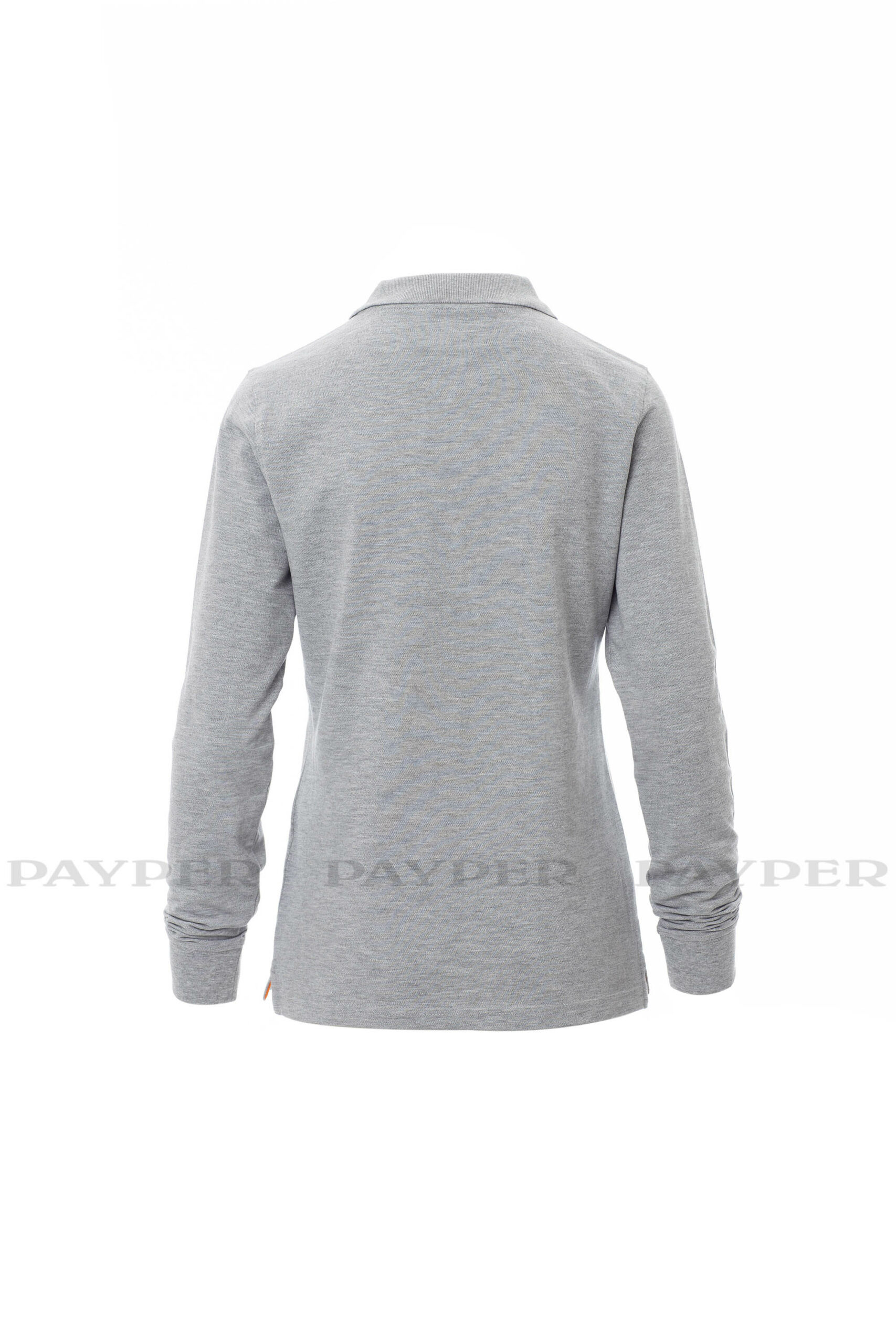 Polo cintré pour femme à manches longues et 4 boutons assortis effet perlé, col et bordure des manches en bord côtes, fentes latérales, coutures du col couvertes avec ruban en contraste, coutures stretch, ruban de renfort latéral, renfort profilé sur encolure arrière