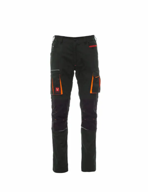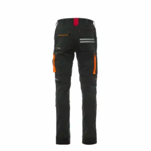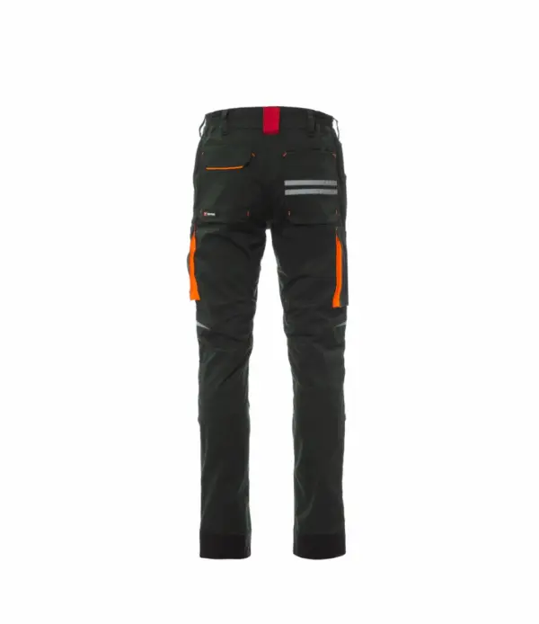 Pantalon unisexe, stretch, multi-saison, avec élastiques latéraux et passants à la taille, fermeture à zip et bouton personnalisé. Doté sur le devant de deux poches profilées, une petite poche porte-monnaie à droite, une petite poche de sécurité fermée par zip à gauche. L’avant de la jambe gauche comporte une poche à soufflet, avec rabat à fermeture autoagrippante et porte-badge. L’avant de la jambe droite comporte : une petite poche pour smartphone avec passepoil rétroréfléchissant et une poche à soufflet. Les deux jambes sont dotées de porte-genouillères, en nylon Oxford 500D, en tissu en contraste, avec ouverture par le bas et d’inserts rétroréfléchissants indiquant l’ouverture. L’arrière comporte : une poche avec rabat et fermeture autoagrippante, une poche porte-mètre (jambe droite) ; une poche ouverte avec deux bandes rétroréfléchissantes (jambe gauche) ; des inserts rétroréfléchissants au niveau des genoux et talonnette en tissu en contraste pour les deux jambes. Coutures à trois aiguilles sur l’entrejambe, l’intérieur et l’extérieur jambe. Baguettes de renfort en contraste à différents endroits. Les tailles (italiennes) centrales 48-50-52 ont un intérieur jambe habituel de 82 cm.