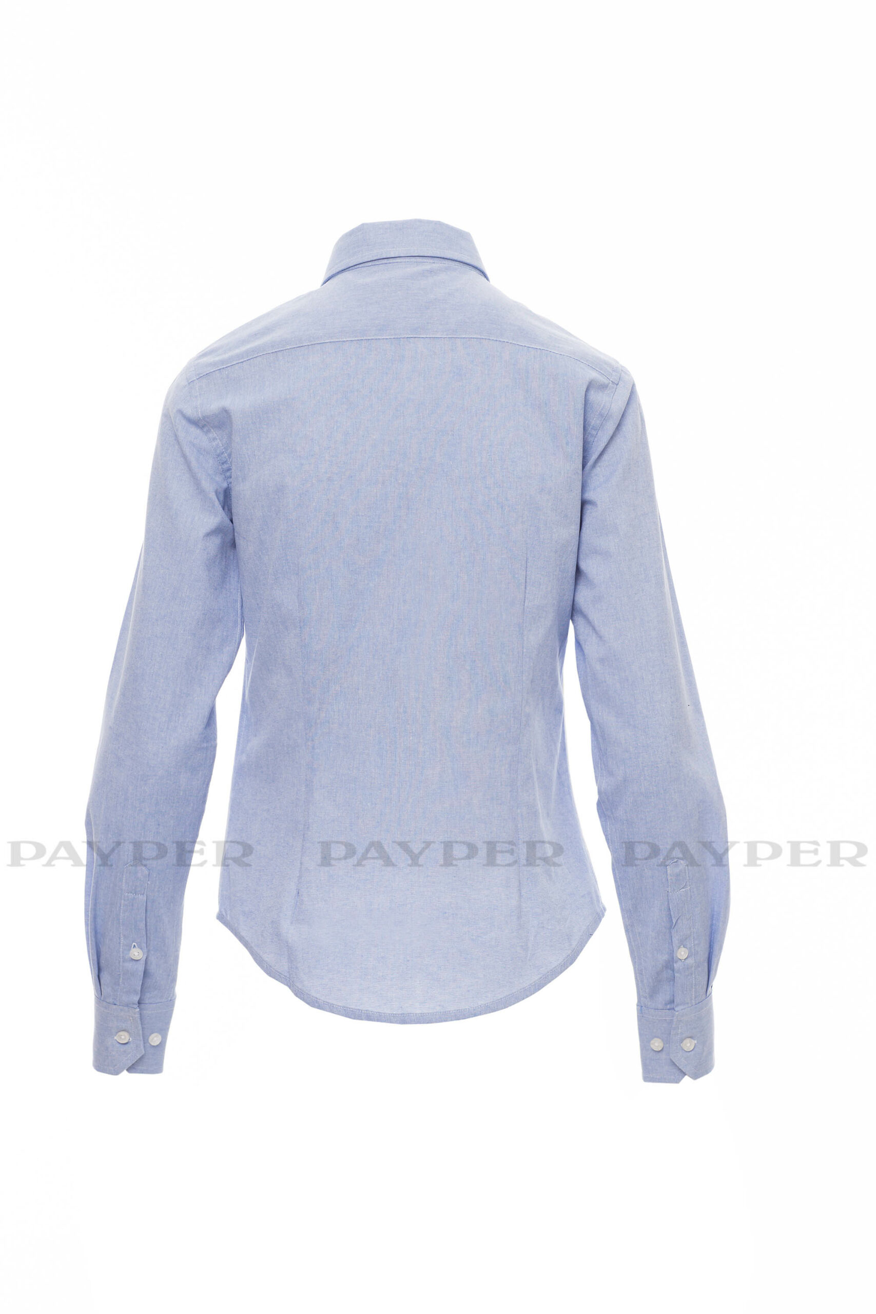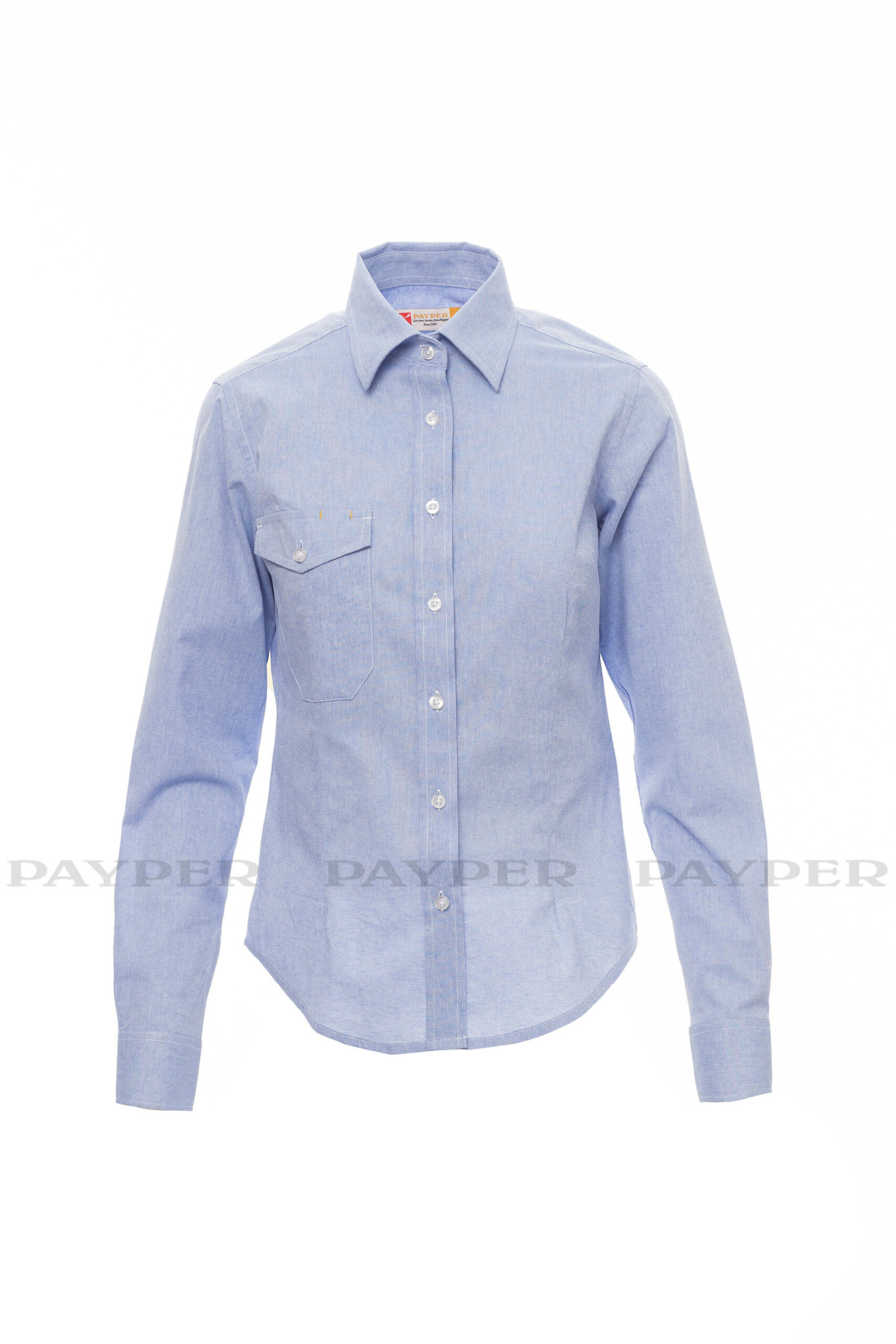 Chemise femme, coupe cintrée, pinces de reprise devant et derrière, col italien, devant avec patte de boutonnage visible et bouton blanc effet nacré . Poignet profilé à deux boutons et une boutonnière . Dos avec empiècement et pinces de reprise . Une poche technique sur la poitrine fermée par rabat avec bouton et deux porte-stylo.
