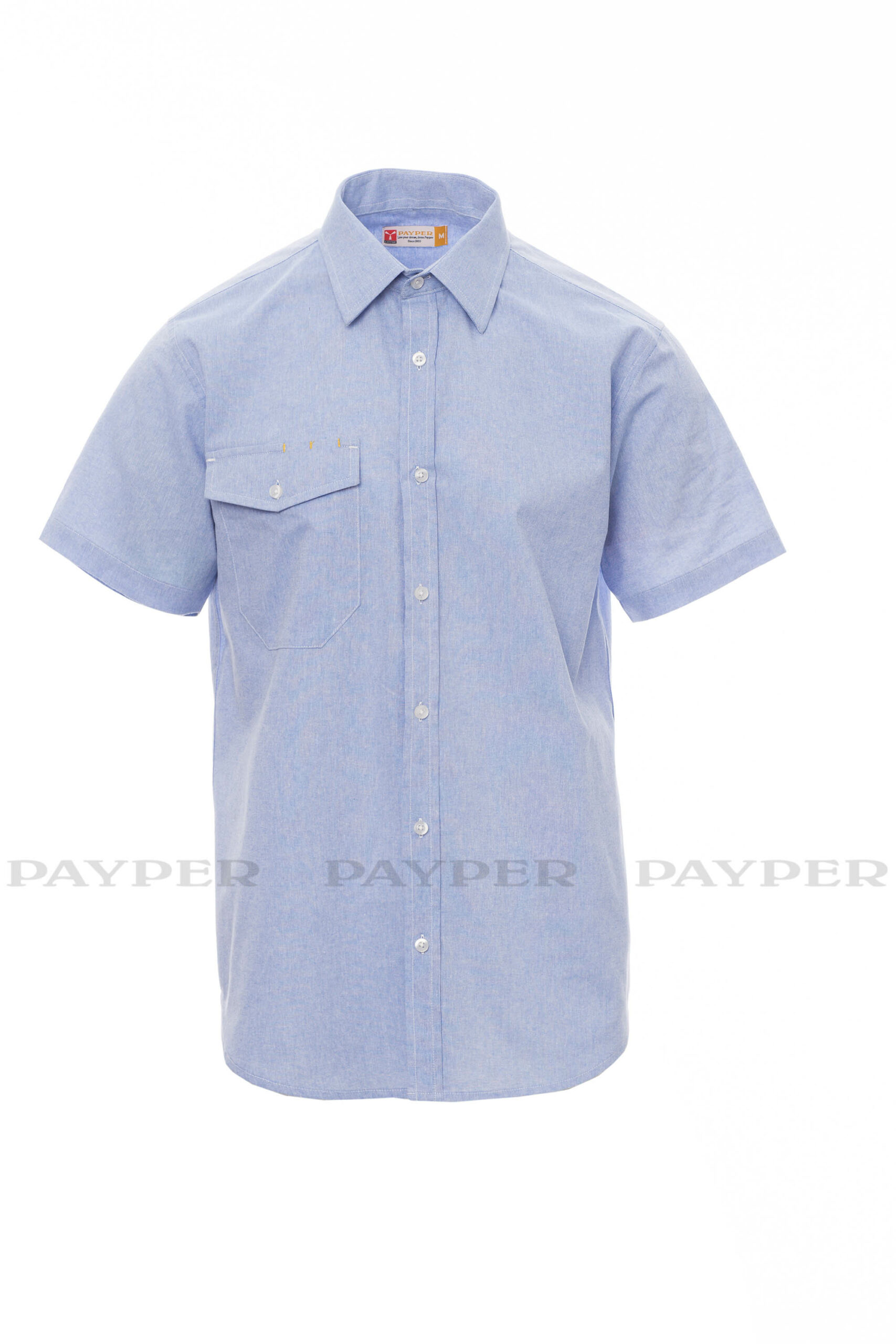 Chemise homme, à manches courtes, à coupe légèrocuments  Imageement cintrée, col italien, devant avec patte de boutonnage visible et bouton blanc effet nacré . Poignet profilé à deux boutons et une boutonnière . Dos avec empiècement et pinces de reprise . Une poche technique sur la poitrine fermée par rabat avec bouton et deux porte-stylo.