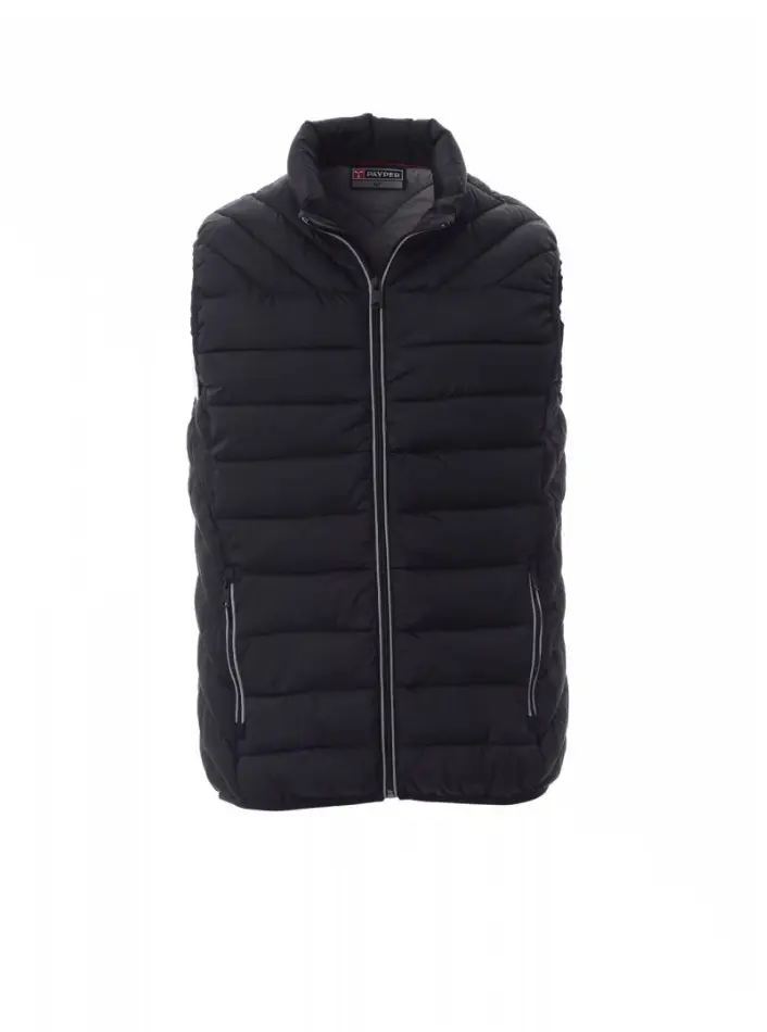 Gilet avec rembourrage en fibres libres (160g/m²), pour homme, fermeture par zip de 5 mm en plastique avec curseur en métal. Fin liseré à la taille. Deux poches extérieures avec zip. Passepoil rétroréfléchissant sur zip. Deux poches intérieures.