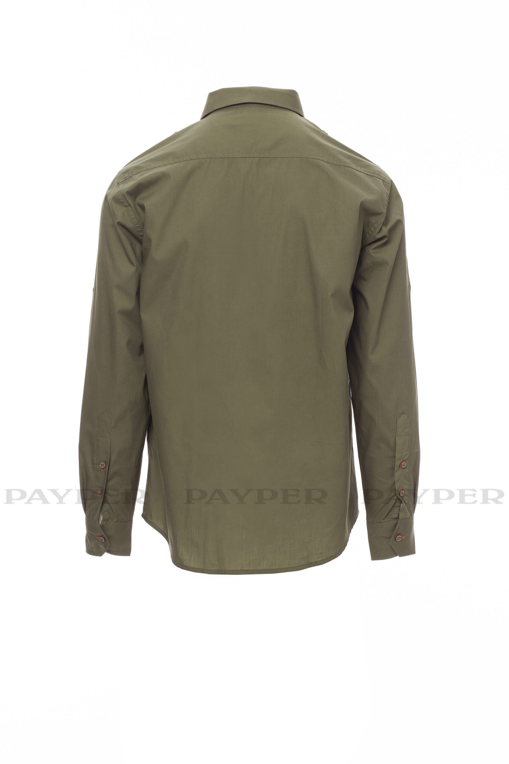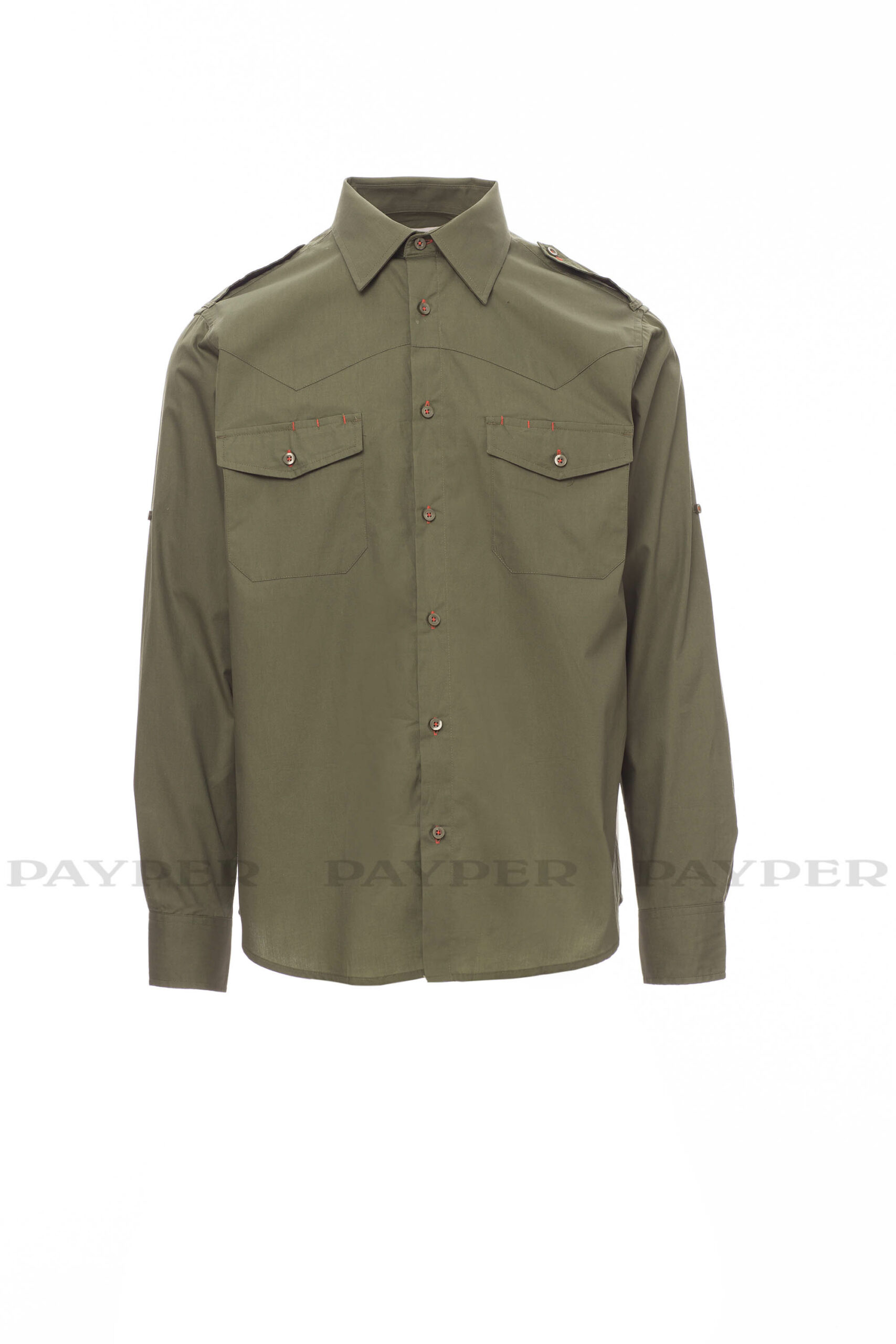 Chemise homme, fil de coton peigné très fin, coupe légèrement cintrée, empiècement droit devant, fermeture par boutons assortis avec boutonnières contrastées, épaulettes, deux poches sur la poitrine avec rabat et porte-stylo . Patte avec bouton sur le bras pour retrousser facilement les manches. La chemise blanche n’a pas de boutonnières contrastées ni d’empiècement devant. Tissu traité Easy Care.