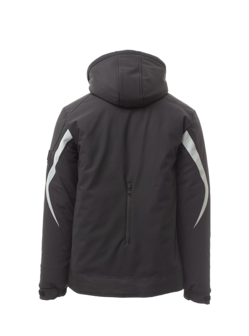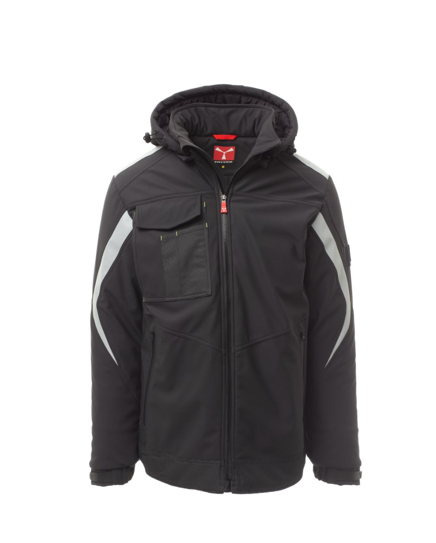 WP 8000 mm H₂O, WVT 5000 g/m² 24h. Soft-shell rembourré pour homme, fermeture par zip SBS avec curseur en métal à verrouillage semi-automatique et tirette personnalisée. Capuche amovible, avec coulisse réglable. Bande rétroréfléchissante sur les épaules et les bras. Poignets élastiques, réglables par velcro et poignet intérieur. Poche poitrine Lock System avec rabat, porte-badge et porte-stylos. Deux poches latérales fermées par zip avec ruban enduit. Élément « life-saving » au dos, avec logo interne rétroréfléchissant, fermé par zip enduit. Deux poches intérieures dont une avec porte-tablette fermée par velcro et une profilée avec zip sur poitrine côté droit. Bas réglable avec stoppeurs personnalisés. Tissu alvéolé avec effet rétroréfléchissant.